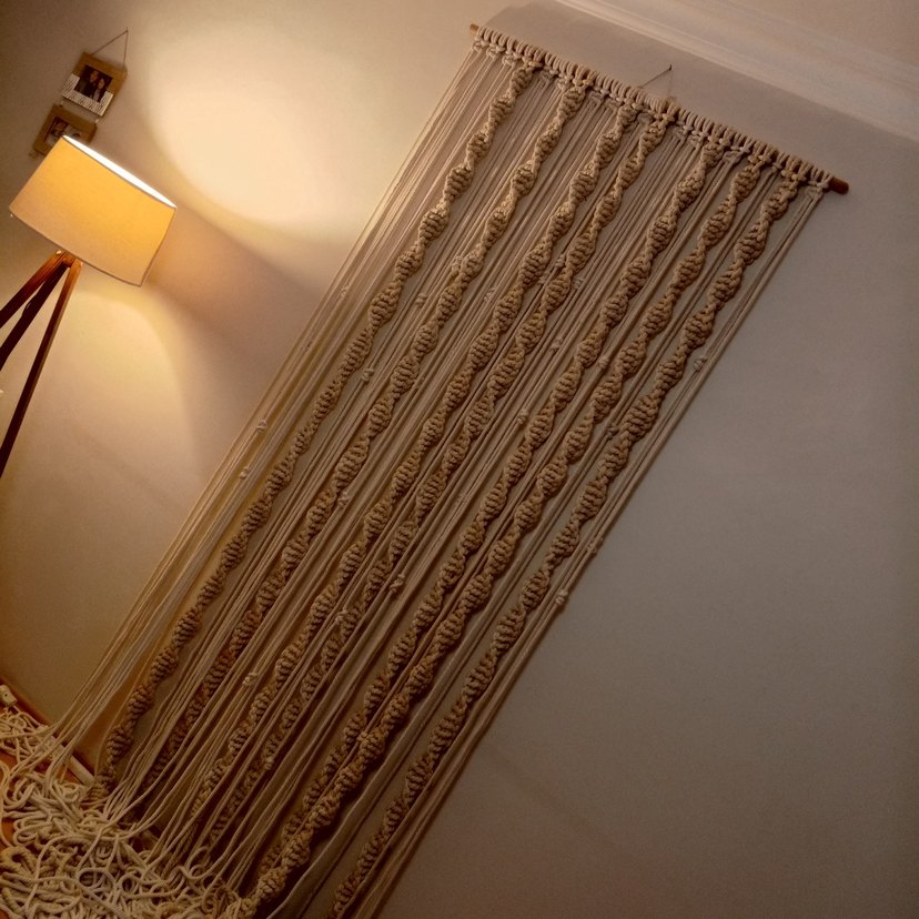 Nakışlı detaylara sahip parlak bej bohem tarzı perde, odaya dokulu ve şık bir hava katıyor.
