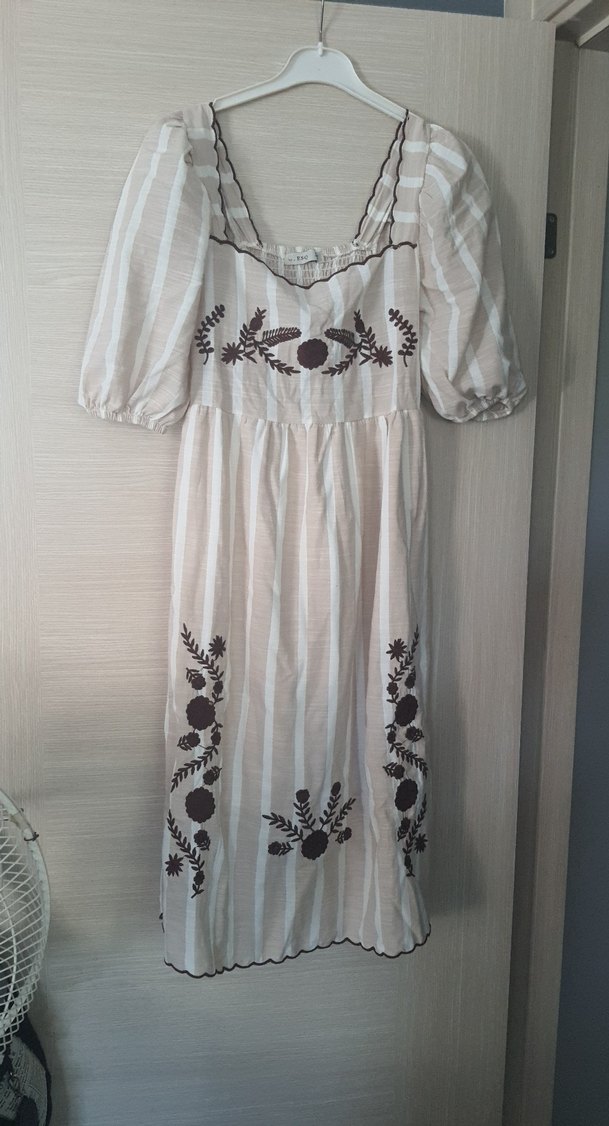 Bej renkte, nakışlı çiçek desenleri ve pile detayları bulunan uzun elbise. Kayık yaka ve kısa balon kolludur, bol kesimiyle rahat bir bohem tarz sunar.