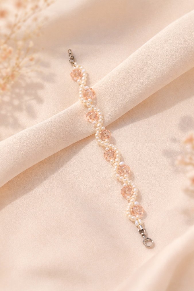 Bej renkte, nakışlı ve pastel tonlarda boncuklarla süslenmiş, vintage tarzda kadın bileklik. Düğünler ve klasik şıklık için uygun.