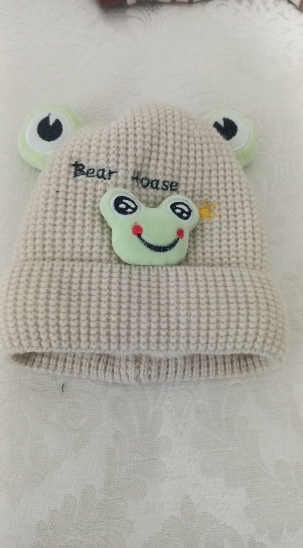 Yumuşak fleece astarlı, nakışlı kurbağa ve göz detaylı bej renkli çocuk bere. "Beartoase" yazılı, renkli ve eğlenceli tasarıma sahip.