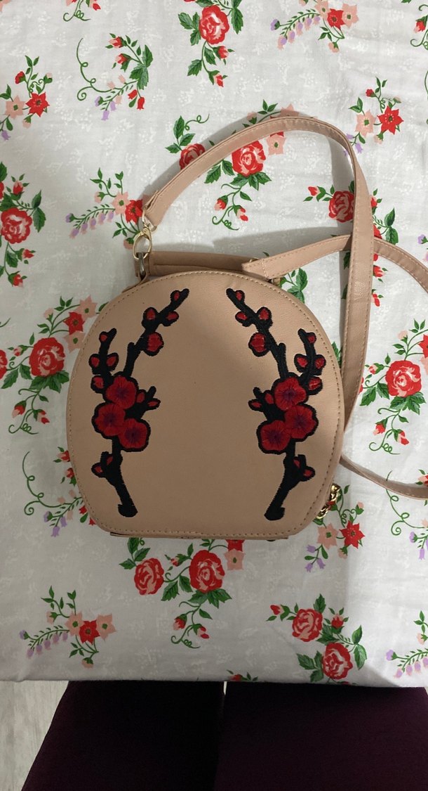 Bej deri kadın çanta, nakışlı çiçek desenleri ve tokalı askıyla bohem tarzda günlük kullanıma uygundur.