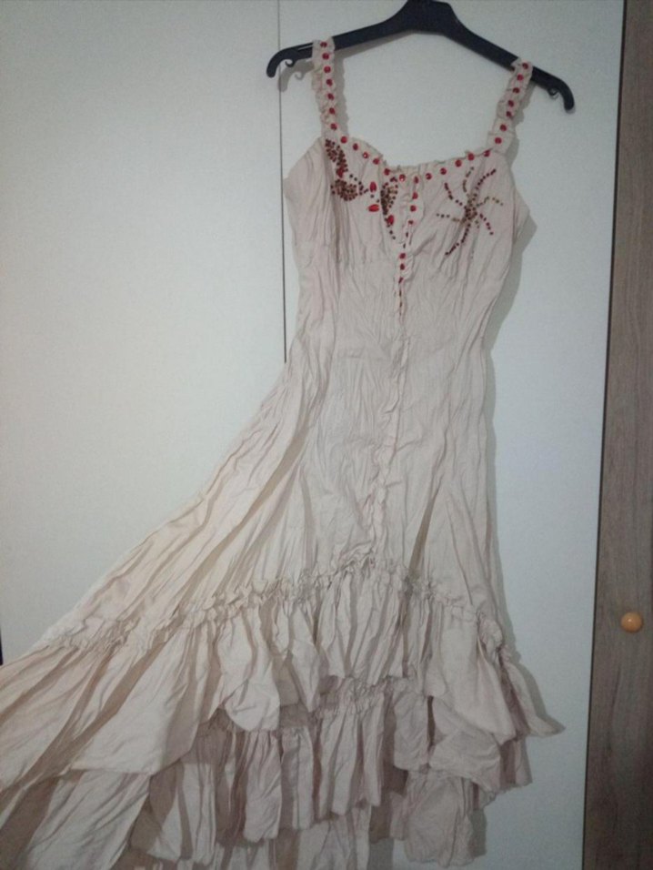 Nakışlı detaylara sahip bej elbise. Katmanlı drapeli tasarım hiç kullanılmamış bir üründür, S ve M bedene uygundur.