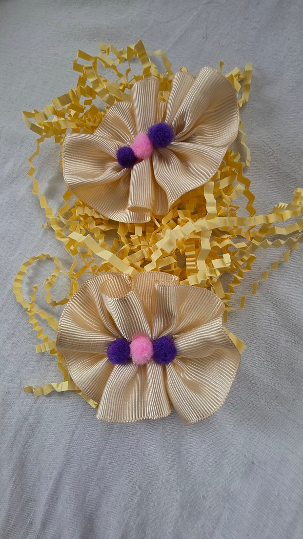 Bej renkli kurdele fiyonkları ve renkli nakışlı ponpon detaylı çocuk tokaları, bohem tarz için uygundur.