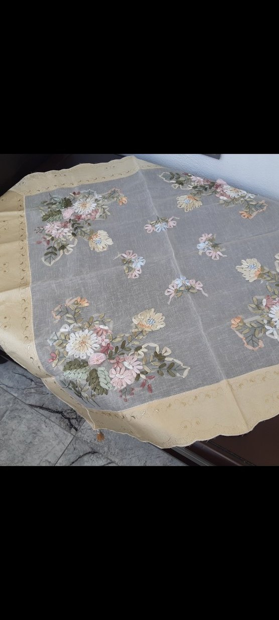 Nakışlı çiçek desenleriyle bej ve gri renkte klasik masa örtüsü, yemek alanınıza zarif bir dokunuş katıyor.