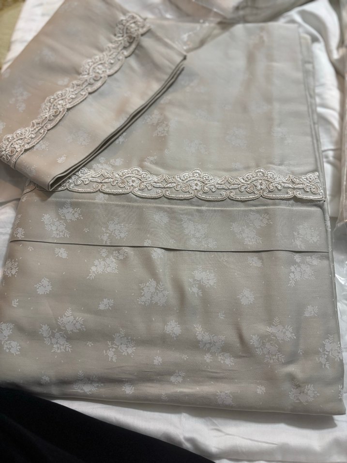 Bej ve gri renklerde, kenarlarında zarif nakış detayları bulunan nevresim ve çarşaf takımı. Yumuşak çiçek desenleriyle şık bir görünüm sunar. ️