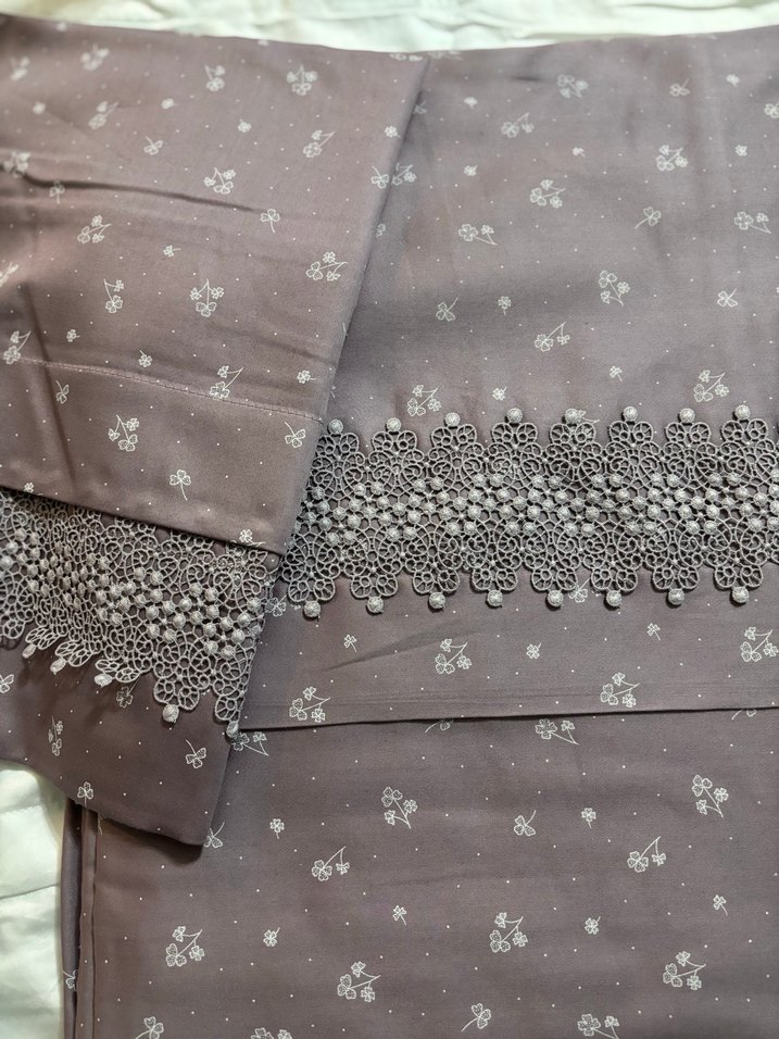 Bej ve gri tonlarında nakışlı, zarif dantel detaylı nevresim ve çarşaf takımı.