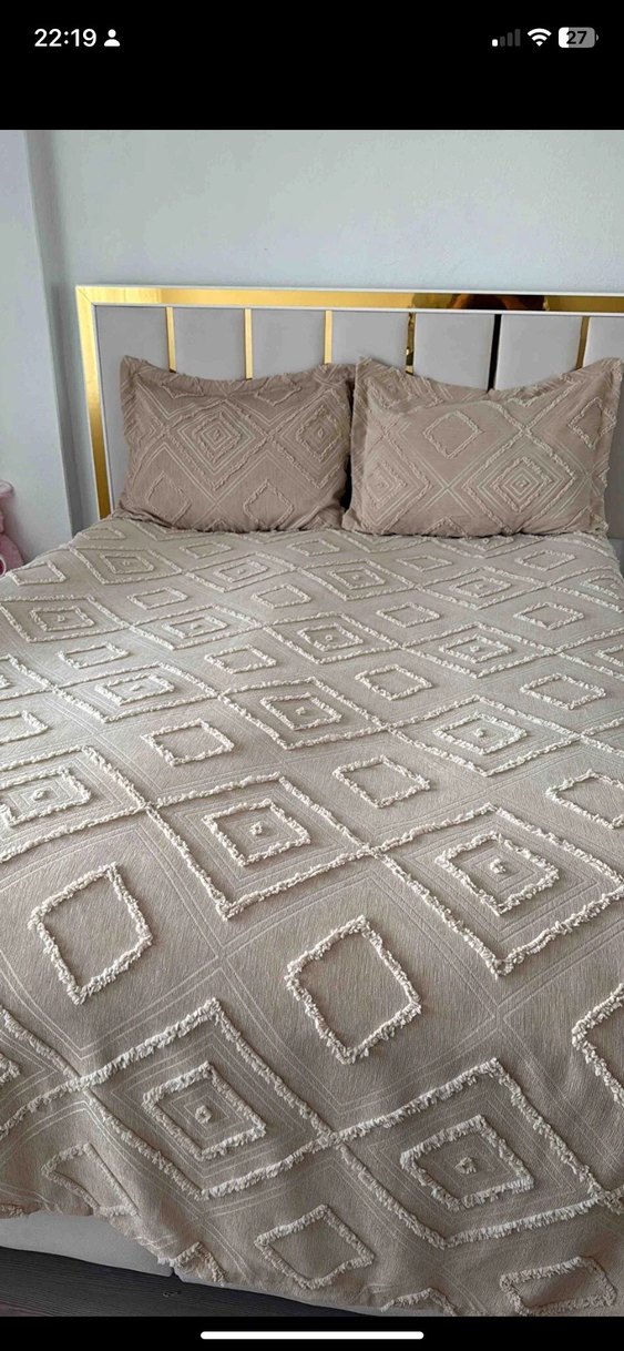 Nakışlı geometrik desenli, bej ve gri tonlarında yatak örtüsüdür, yatak odasına doku ve şıklık katar. ️