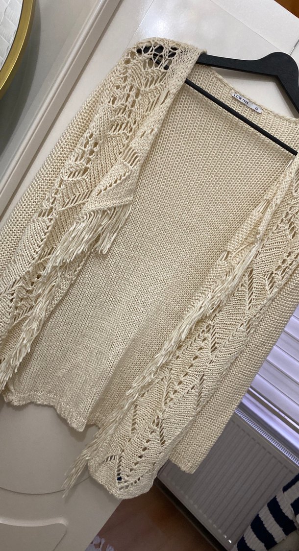 Nakışlı desenli ve püsküllü bej renkli örme hırka, uzun kollu, V yakalı ve bol kesimdir. Rahat bohem tarzı ile günlük kullanıma uygundur.