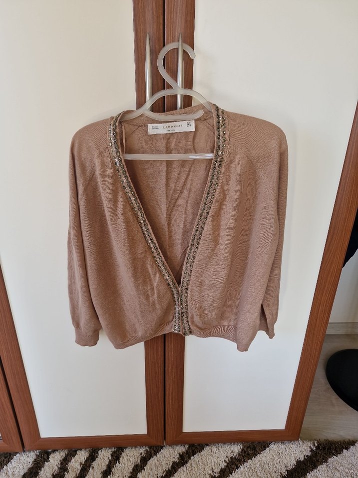 Bej renkli, nakışlı ve örme dokulu kadın hırka. Parlak yüzeyli, bol kesim, uzun kollu ve V yakalı, günlük kullanıma uygun.