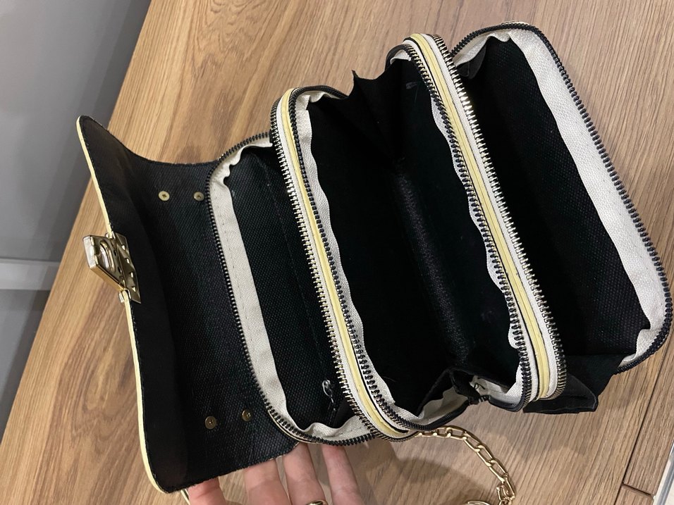 Nakışlı detaylara ve çoklu fermuarlı bölmelere sahip siyah kadın portföy çanta. Sentetik kumaştan yapılmıştır, avant-garde ve Paris tarzını yansıtır. Üstünde ve askısında defolar mevcut