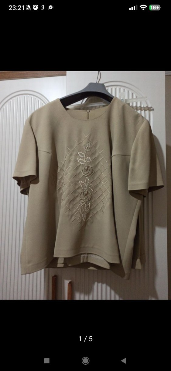 Bej renkli, kısa kollu, bol kesim kadın bluz. Yuvarlak yaka ve drapeli tasarıma sahip, nakışlı desenli ve sentetik kumaftan üretilmiştir. ceket ve pantolon dahildir. Takım halinde satılacak. Bir kere giyildi.
