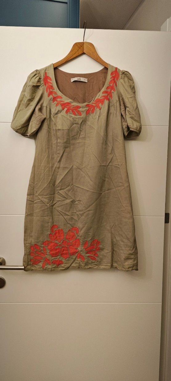 Kırmızı nakış detaylı, kısa kollu, straplez yakalı, bol kesim bej keten hamile tunik. Günlük kullanıma uygun drapeli tasarım.