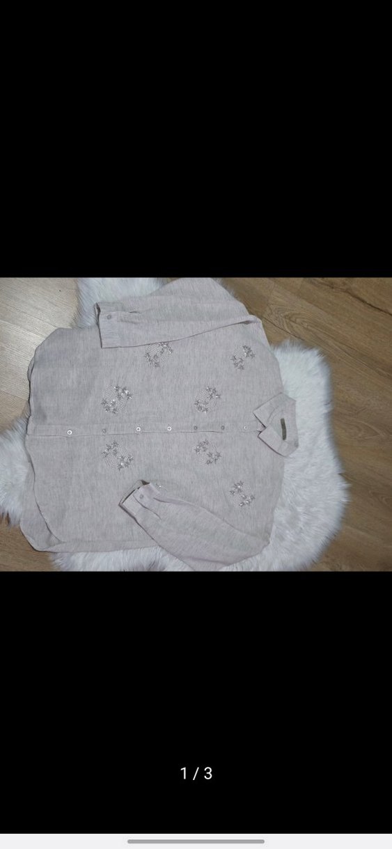 Bej keten gömlek, uzun kollu ve düğmeli olup nakış detaylara sahiptir. Salaş kesimi ve yuvarlak yaka tasarımıyla günlük bohem tarz sunar.