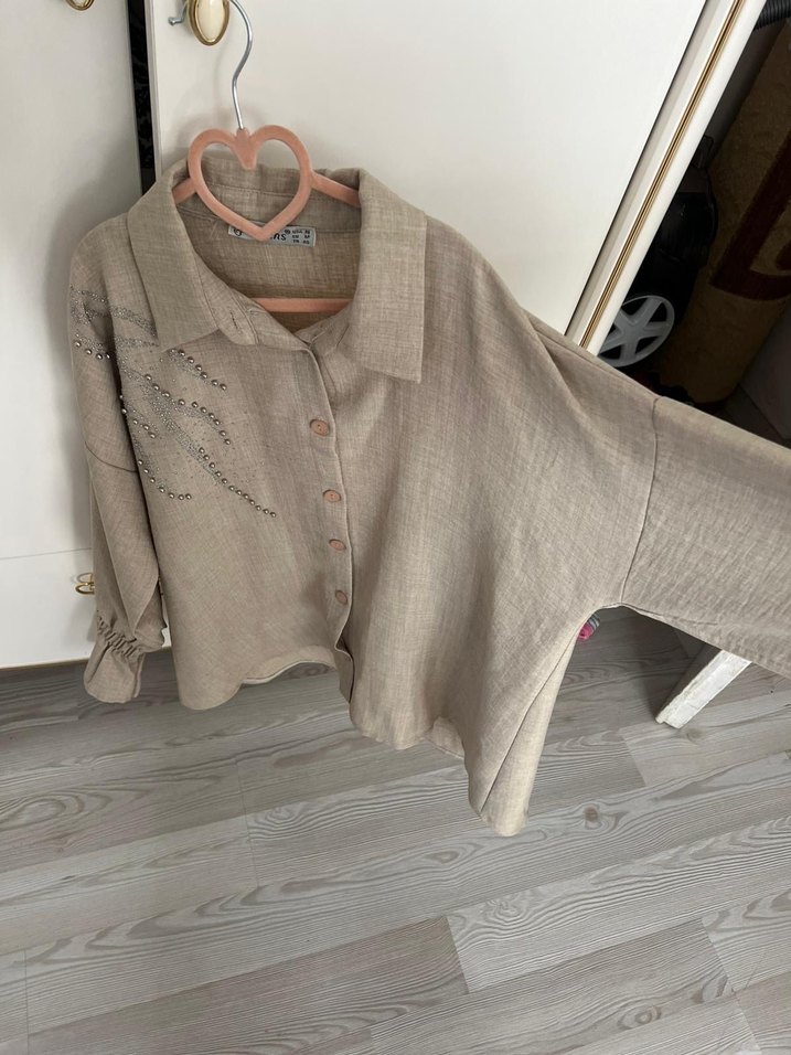 Uzun kollu, V yaka, düğmeli bej keten gömlek. Nakışlı, bol kesim ve kısa uzunlukta, bohem ve rahat tarzda günlük kullanım için uygun.