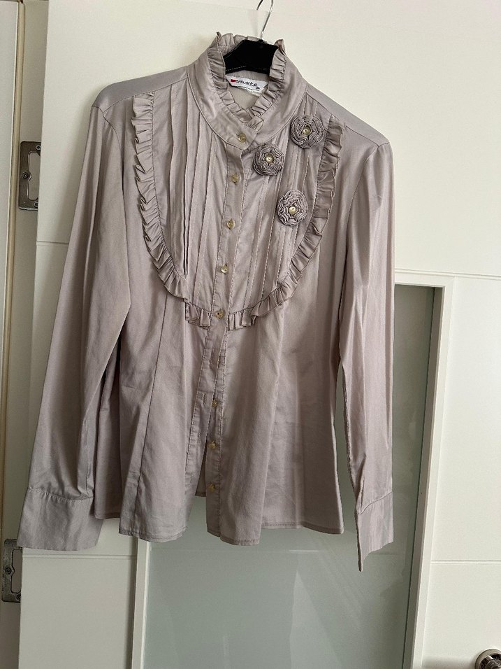 Düğmeli, yakalı, uzun kollu, bol kesim bej keten gömlek. Nakış detayları ve bohem tarzıyla ofis için uygun. 44-46 bedene uygun