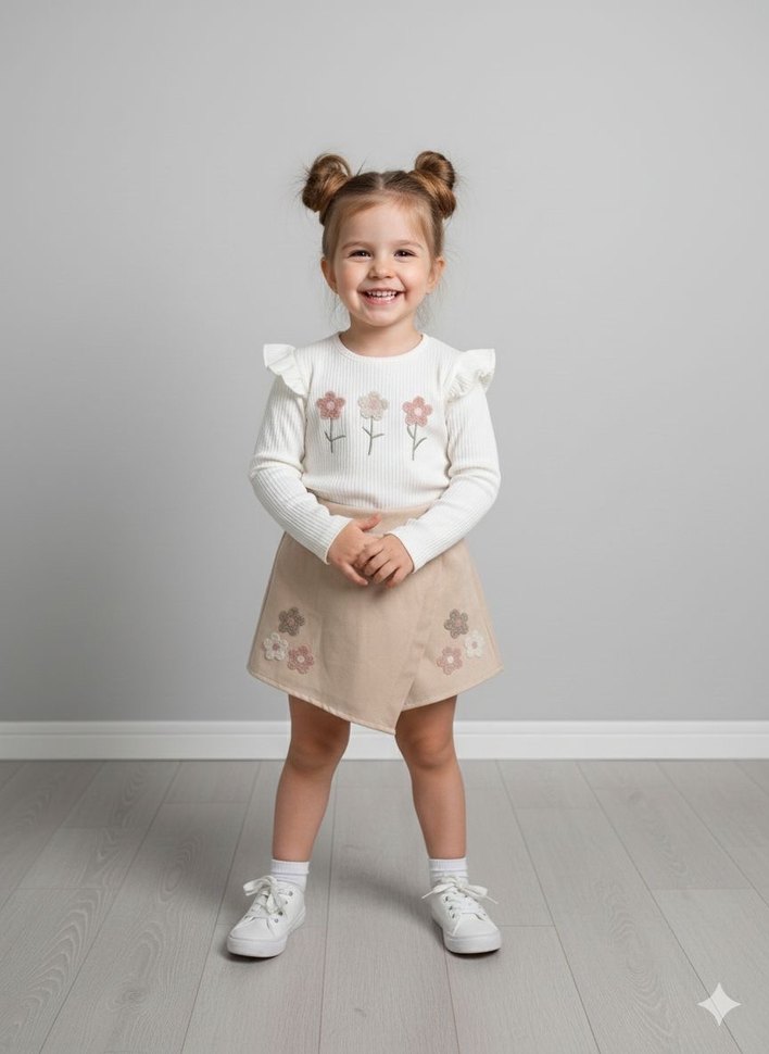 Bej renkte, nakışlı çiçek detaylarına sahip, pamuk kumaştan rahat ve şık kız çocuk eteği.