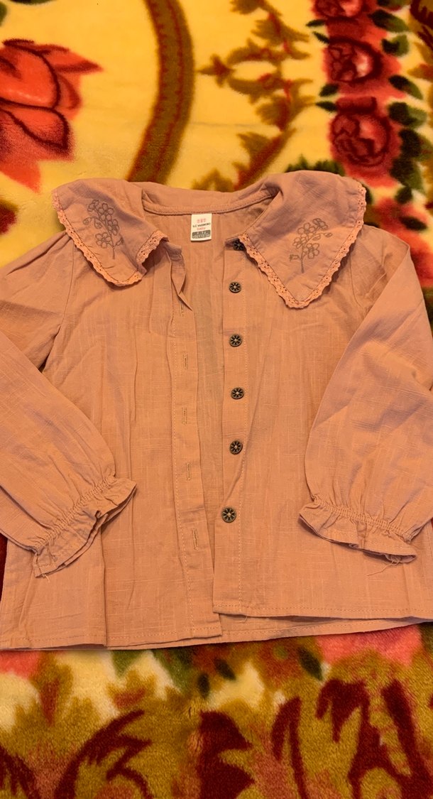 Bej renkli, nakışlı ve düğmeli kız çocuk gömleği. Keten kumaştan, bol kesim, uzun kollu ve yakalıdır. Bohem tarzı sunar.