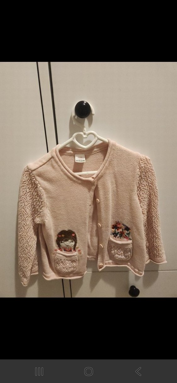 Bej renkli, uzun kollu kız çocuk triko hırka, nakışlı ceplerle süslenmiş, bol kesim ve normcore tarzda.