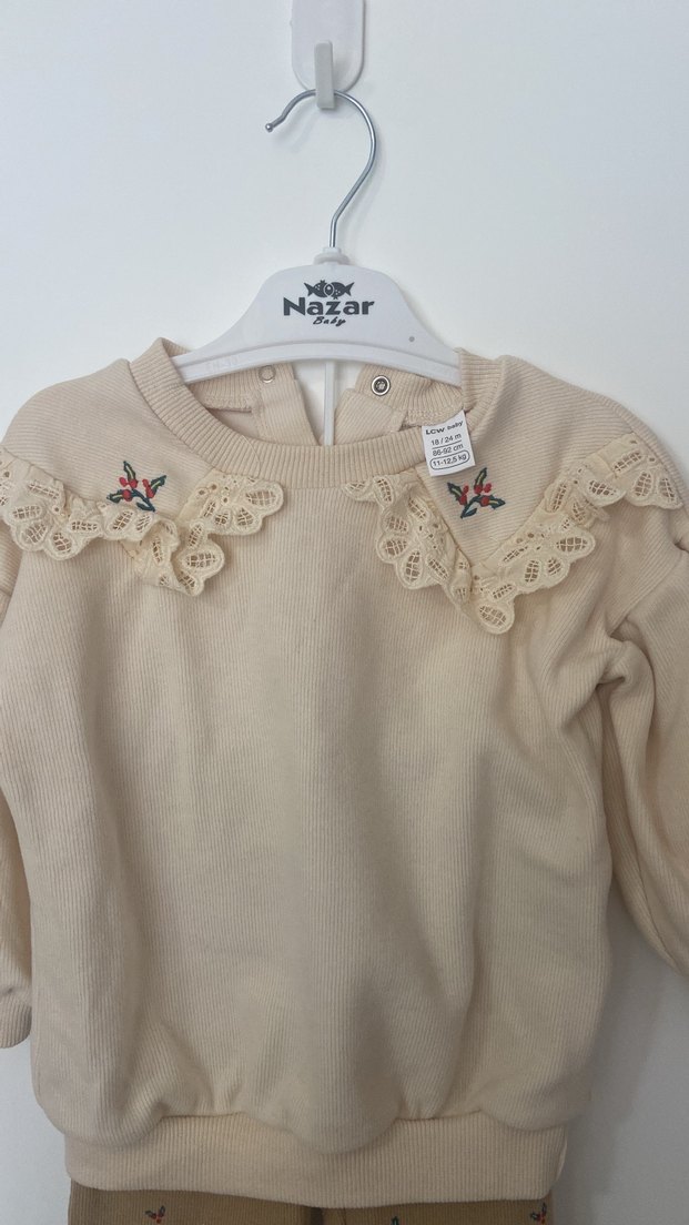 Bej renkli kız çocuk triko sweatshirt, uzun kollu ve yuvarlak yaka. Nakışlı çiçek detayları ve dantel süslemeleriyle rahat ve yumuşak bir dokunuş sunar. Pastel tonlarda şık bir model.