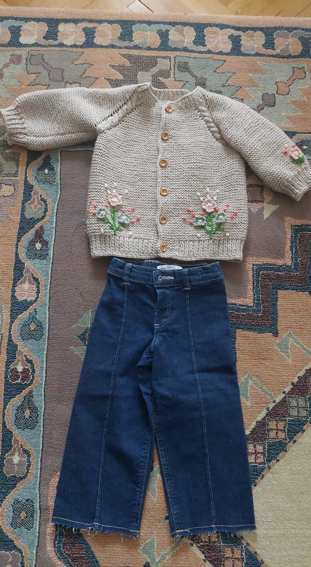 Bu bej renkli örme kız hırkası, uzun kollu ve bol kesimdir, ön ve kollarda çiçek nakışı vardır.