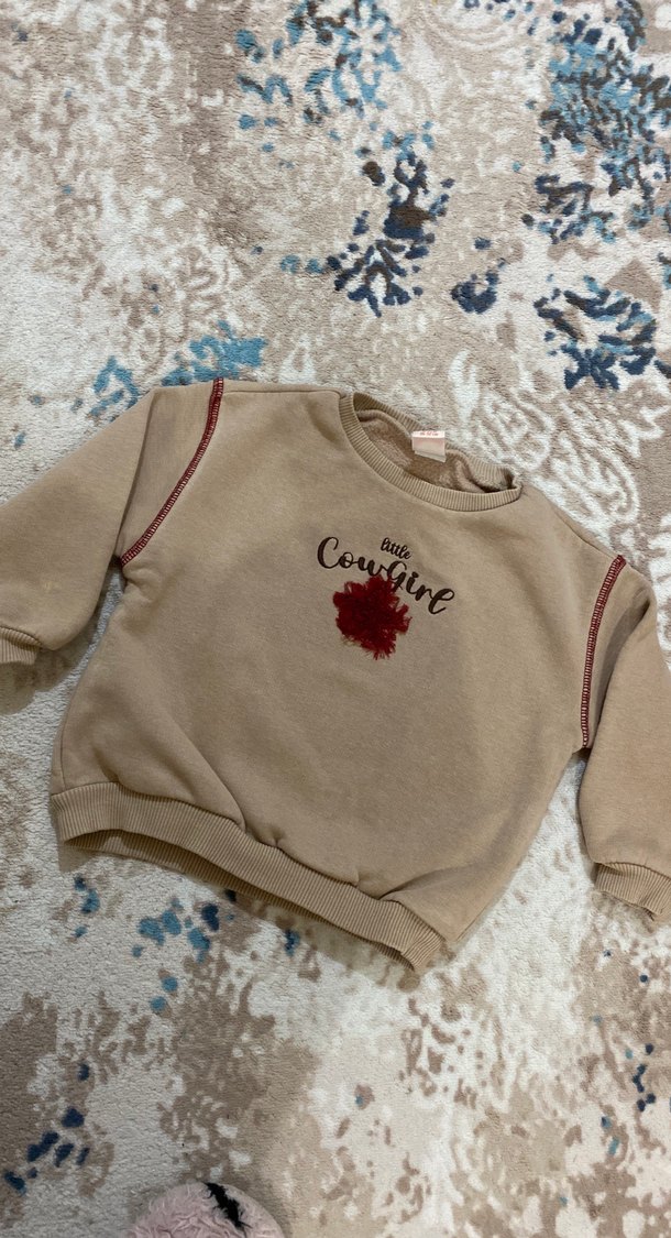 Bej renk, uzun kollu, yuvarlak yakalı ve bol kesim kız sweatshirtü. Örgü kumaştan üretilmiş, nakışlı detaylara ve koyu renk dikişlere sahip. Kolunun arkasında sok fotoda gösterdiğim çamaşır suyu deymiş sanırım ama belli olmuyor giyildiğinde