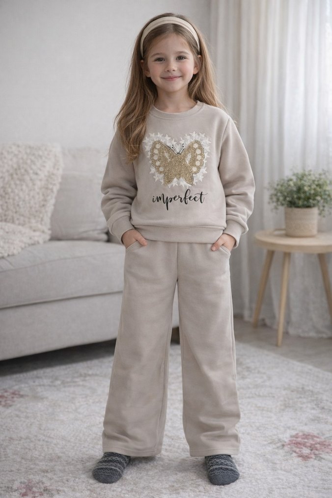 3-4 / 5-6 / 7-8 / 9-10 yaş Bej renkli, nakışlı kelebek desenli, ince yumuşak kumaştan, bol kesim kız sweatshirt ve pantolon takımı.