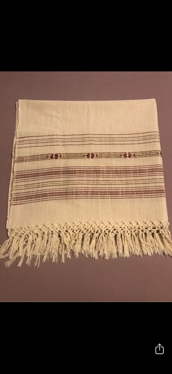 Hafif bej renkte, geleneksel nakışlı desenlere ve püsküllü kenarlara sahip masa örtüsü, yemek alanınıza klasik bir dokunuş katıyor ham keten üzerine ipek işlemidir Bursa ipek fabrikasından alınmıştır. El işlemesi.