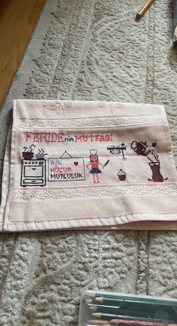 Bej renkte, pastel nakış detaylı mutfak havlusu. Ocak, aşçı ve kahve değirmeni figürleri ile süslenmiştir. Yumuşak kumaş, karşı kültür tarzında. ☕