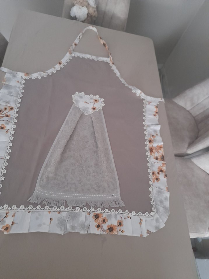 Bej renkte, nakış detaylı ve çiçek desenli kenar süslemeli mutfak önlüğü. Yumuşak kumaş ve dantel detaylarıyla şık bir görünüm sunar.