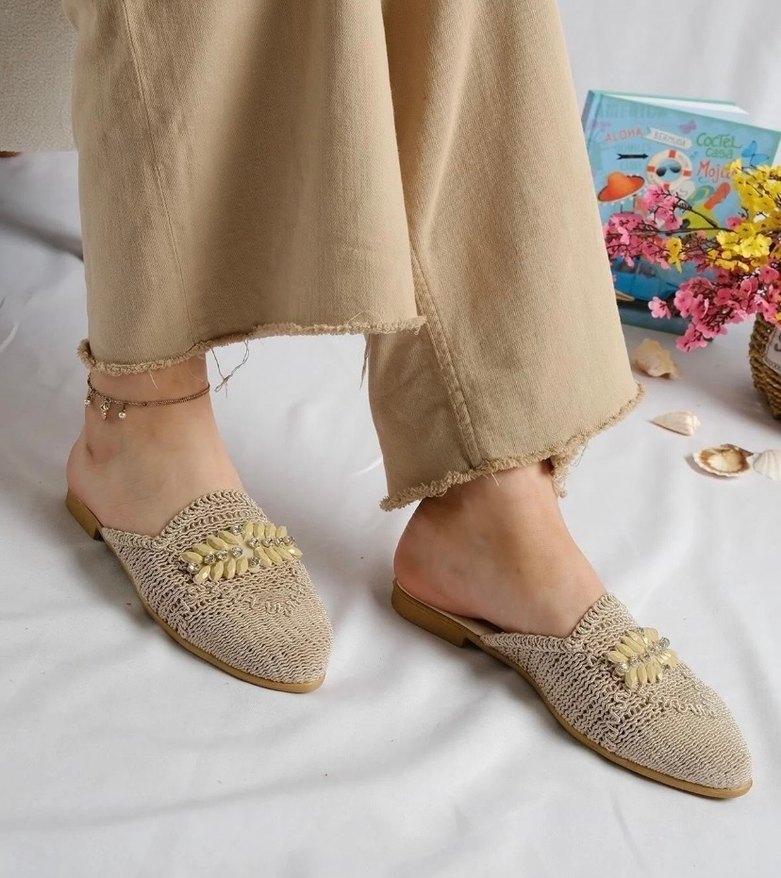 Bej renkli örgü terlikler, blok topuk ve nakışlı detaylarla bohem tarzını günlük rahatlıkla buluşturur. Rahat ve şık kullanım sağlar.