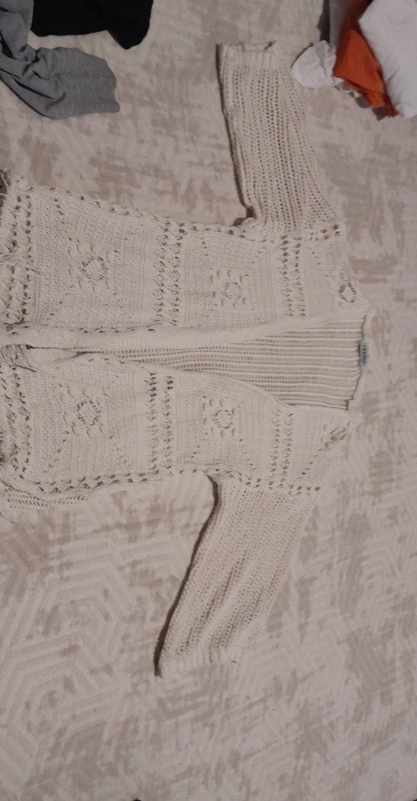 Bej renkli, uzun kollu, nakışlı ve notched lapel yakalı örgü hırka. Gevşek kesim ve midi boyda, bohem tarzı rahat bir parça.