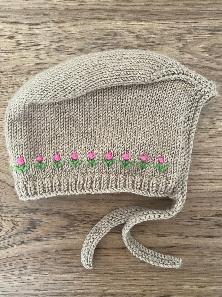 Nakışlı pembe çiçek desenli, bağcıklı bej örgü çocuk bere, bohem tarzda.