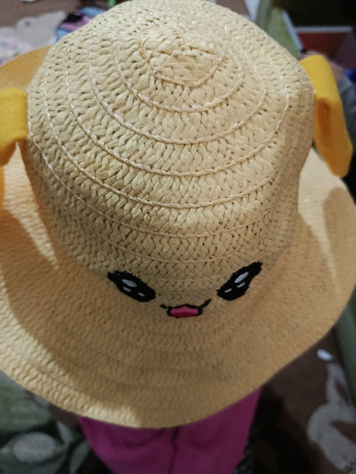 Nakışlı sevimli yüz detaylı, fırfırlı bej örgü çocuk şapkası, renkli ve bohem tarzda.