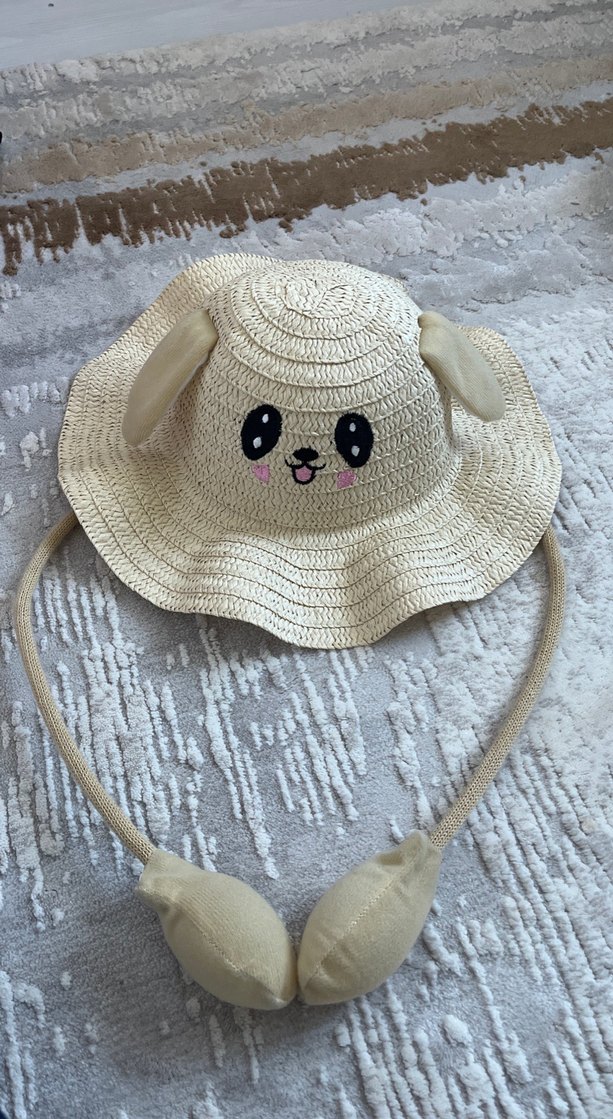 Nakışlı sevimli yüz ve kulak detaylı bej örgü çocuk şapkası, uzun örgülü bağlarla birlikte. Yumuşak ve rahat, oyun dolu günler için.