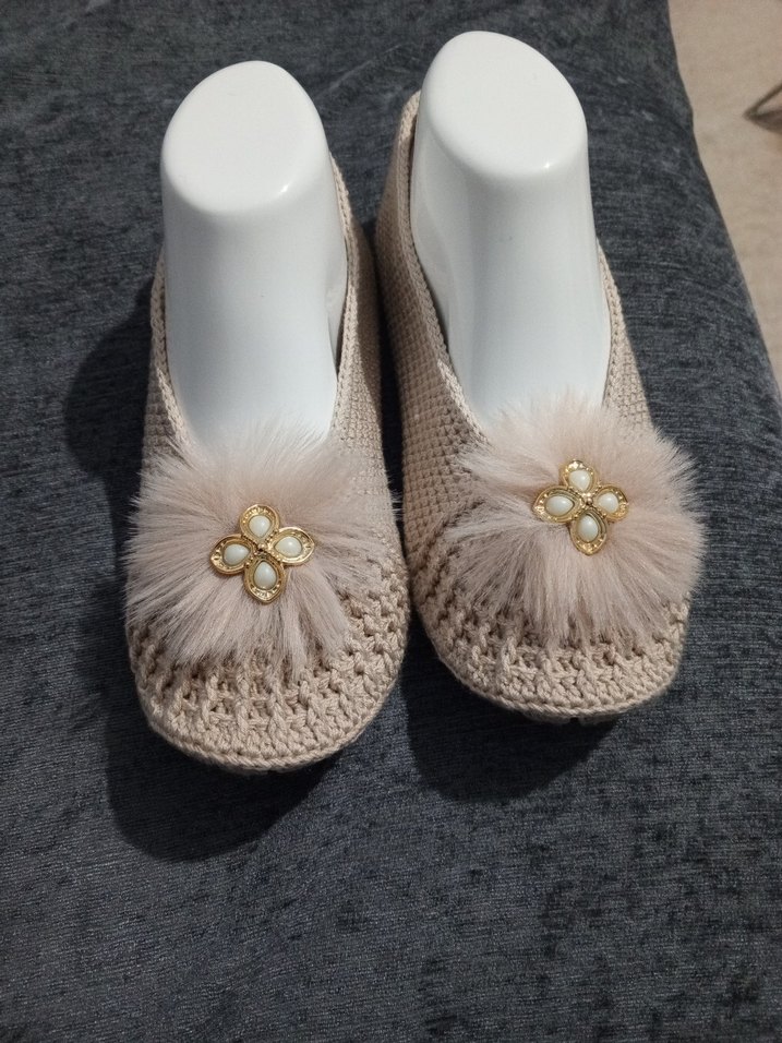 Nakışlı Bej Örgü Kadın Terlik