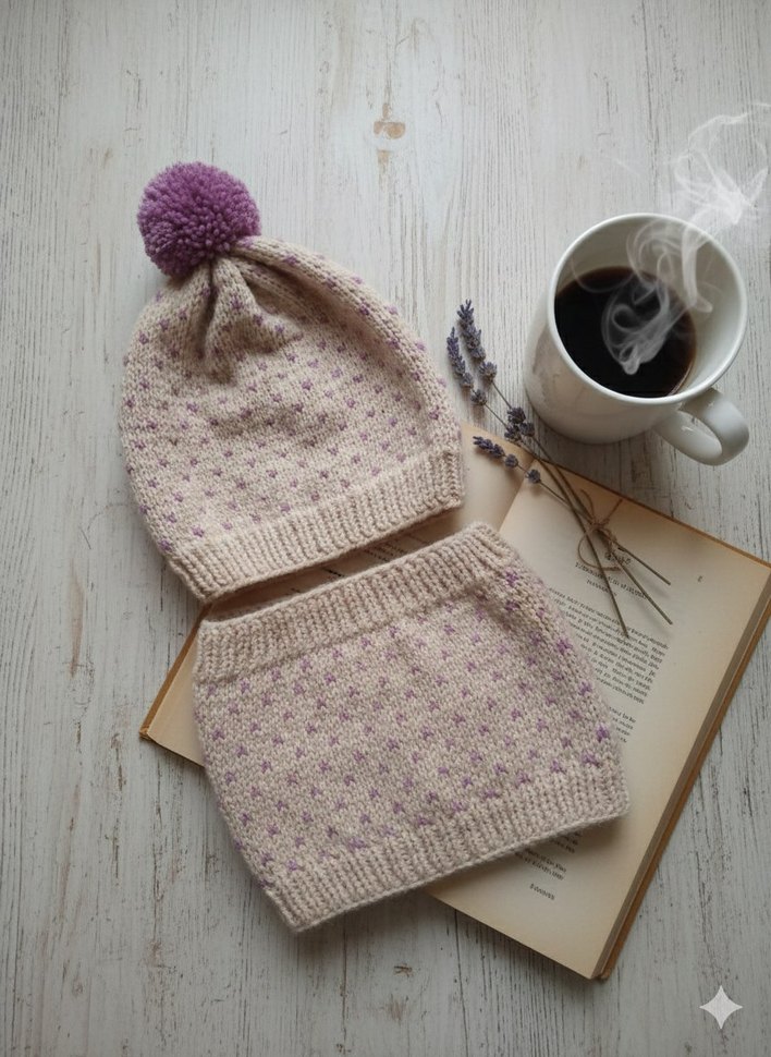 Bohem tarzda, pastel bej renkli nakışlı örgü çocuk bere ve boyunluk seti. Bere üzerinde pembe ponpon bulunmaktadır. ❄️