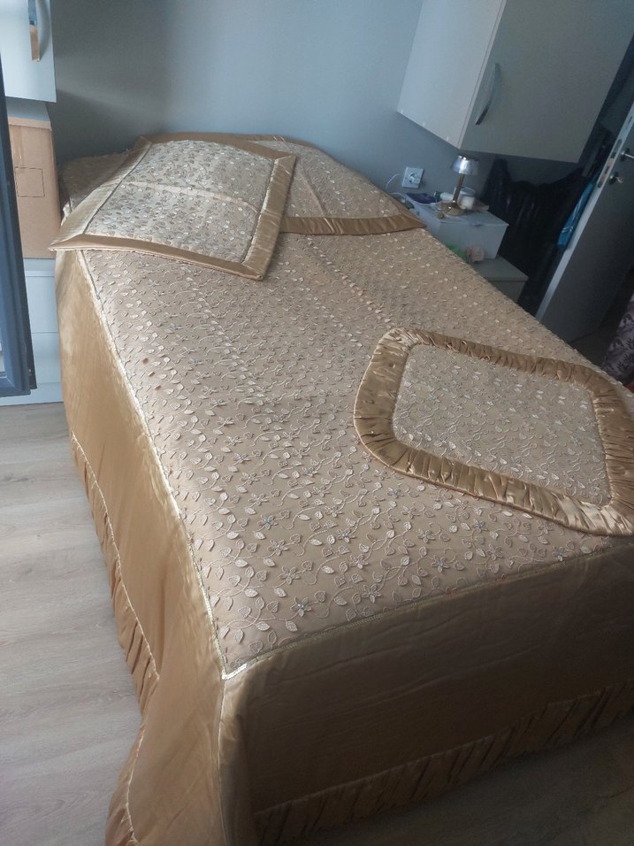 Bej renkli, nakışlı ve parlak yüzeye sahip yatak örtüsü, uyumlu yastık kılıfları ile birlikte sunulmaktadır. ️