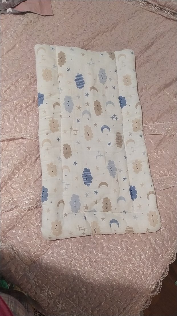 Bej renkte, pastel tonlarda bulut, yıldız ve ay nakışlı, yumuşak sentetik kumaştan çocuk uyku minderi.