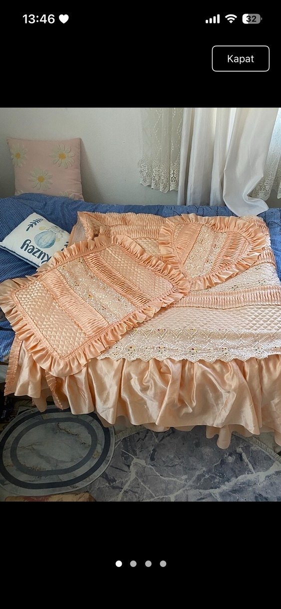 Bej renkli, pastel tonlarda nakışlı ve fırfırlı kenar detaylı yatak örtüsü, yatak odasına zarif bir dokunuş katıyor. ️