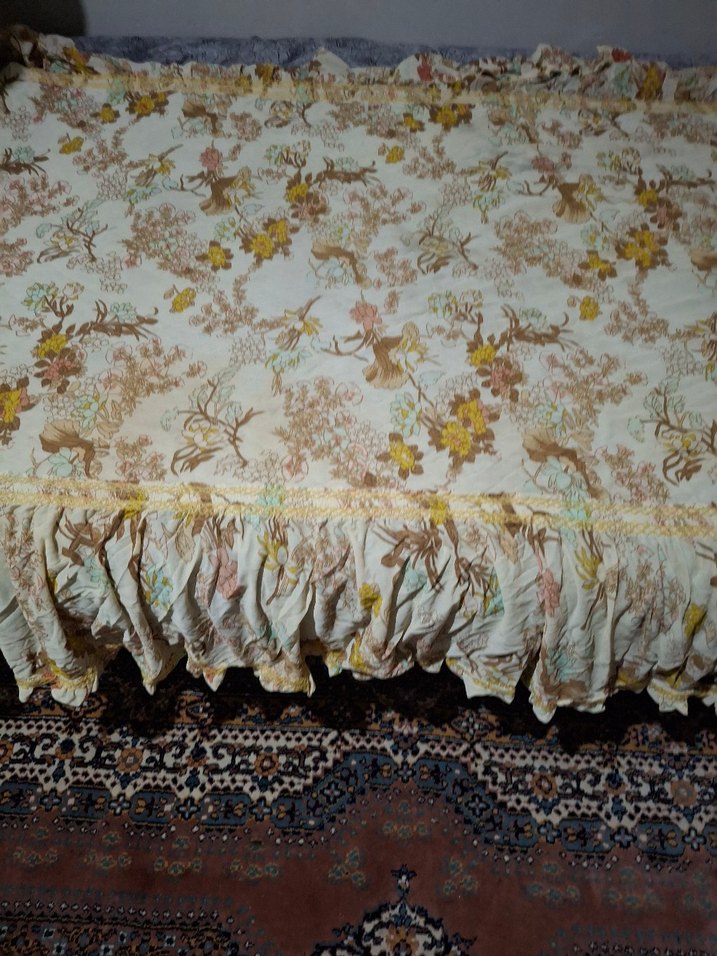 Bej renkli yatak örtüsü, pastel tonlarda çiçek nakışları ve fırfırlı kenarlarla yumuşak ve şık bir görünüm sunar.