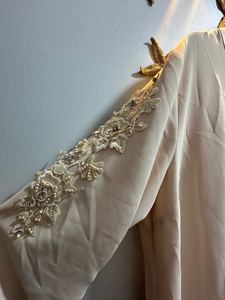 Bej renkte, nakışlı detaylara sahip, drapeli ve bol kesim uzun abiye elbisedir. Askılı kollu ve straplez yakaya sahiptir, düğün için uygundur.