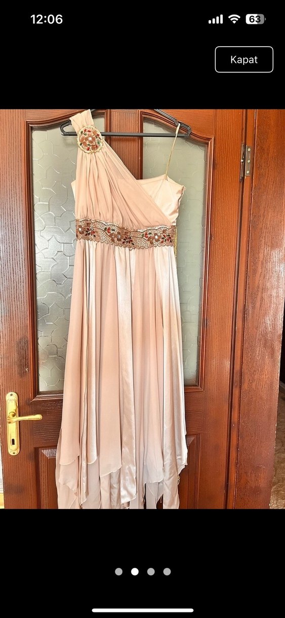 Sadece bir kez giyildi. Bej renkli, nakış işlemeli, drapeli ve askısız uzun abiye elbise. Kolsuz, rahat kesimli ve modern klasik tarzda, düğünler için uygundur.