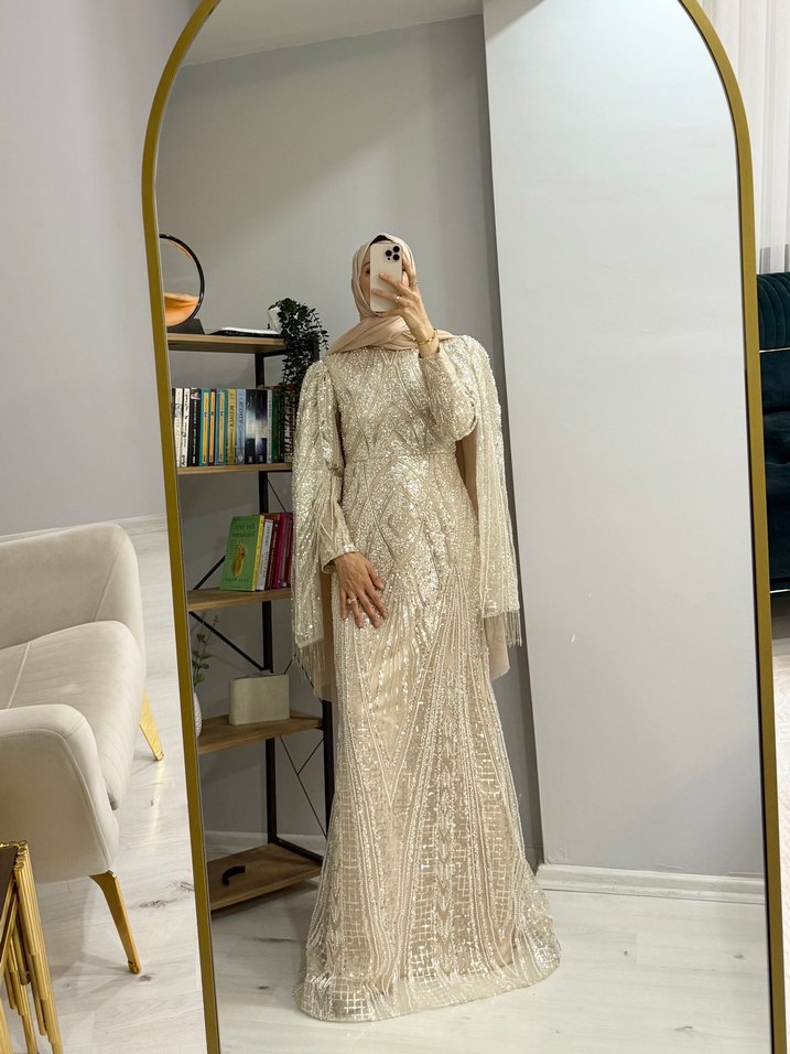 Nakışlı Bej Uzun Abiye Elbise