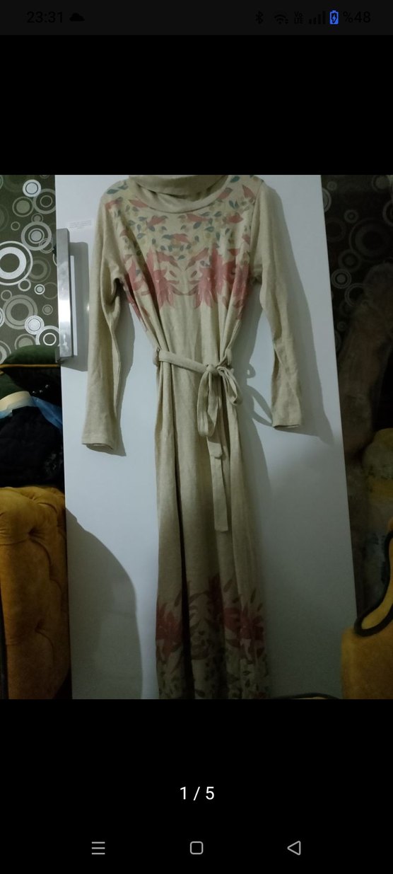 Bej renkli, uzun, yüksek yakalı, nakışlı ve bol kesim elbise. Drapeli tasarım ve bel bağlama detayına sahip, rahat bohem tarzı.