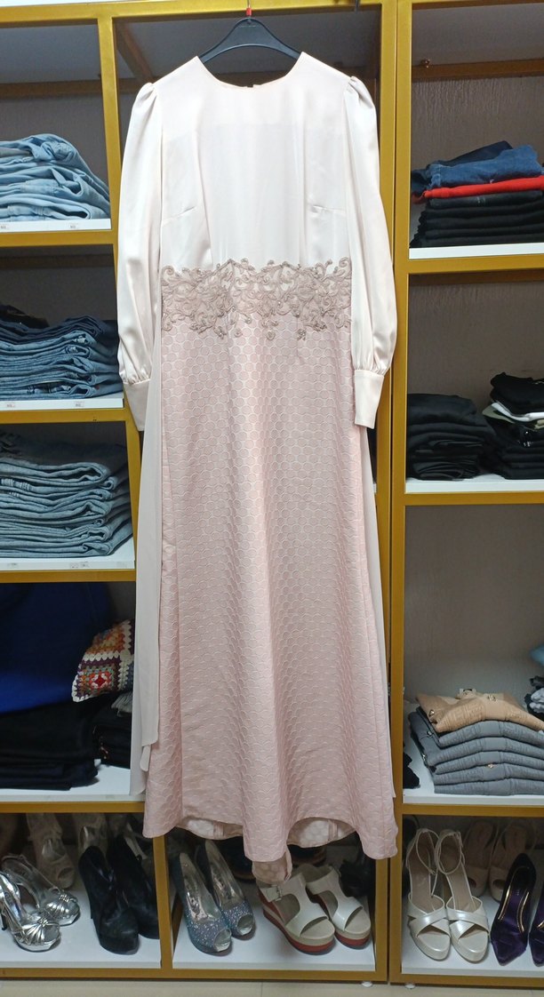 Nakışlı detaylara ve drapeli tasarıma sahip bej uzun elbise, klasik ve vintage bir görünüm sunar. Uzun kollu ve normal kesimdir, düğünler için uygundur.
