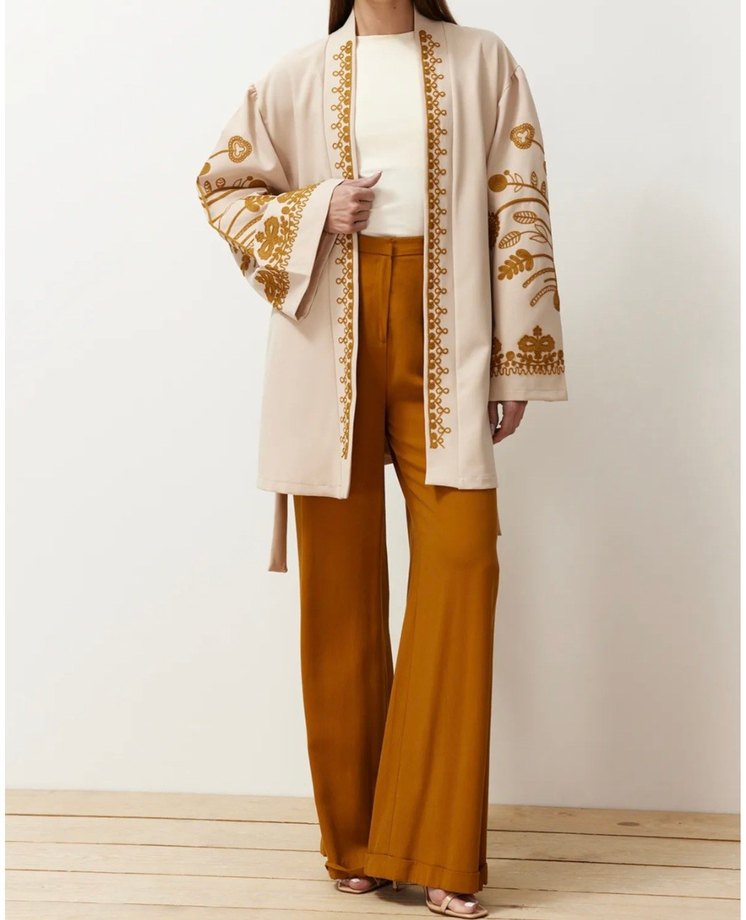 Nakışlı detaylara sahip bej uzun kimono, kuşaklı ve uzun kolludur. İpeksi kumaştan, bohem tarzda rahat kesimdir.