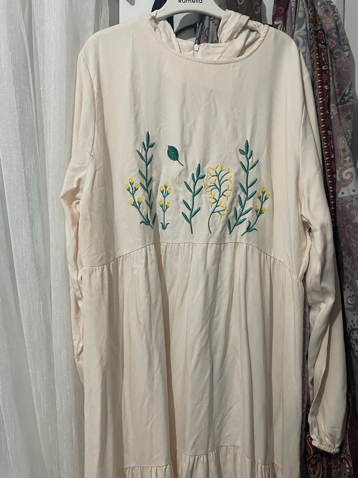 Nakış işlemeli, uzun kollu, yüksek yakalı, keten kumaştan bej uzun elbise. Bol kesim ve dökümlü tasarıma sahip, bohem tarz için uygun.