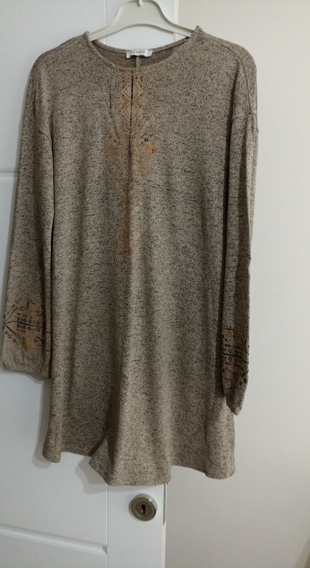Yumuşak keten kumaştan, nakışlı detaylara sahip, bej renkli uzun kollu, bol kesim triko elbise. Rahat ve bohem tarz için uygundur. S beden ama L bedene uygundur.