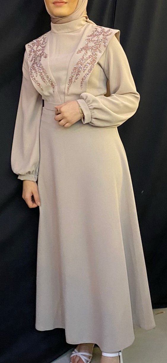 Nakışlı Bej Uzun Kollu Uzun Elbise