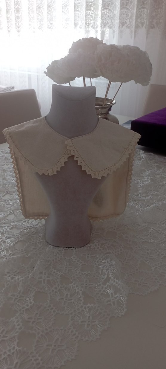 Nakışlı detaylara ve ince dantel süslemeye sahip bej bebek önlüğü, geniş yakalı tasarımıyla dikkat çekiyor. kendi dikimim dolabımda yetişkin ve kız çocuk seyyar yaka çeşitleri var